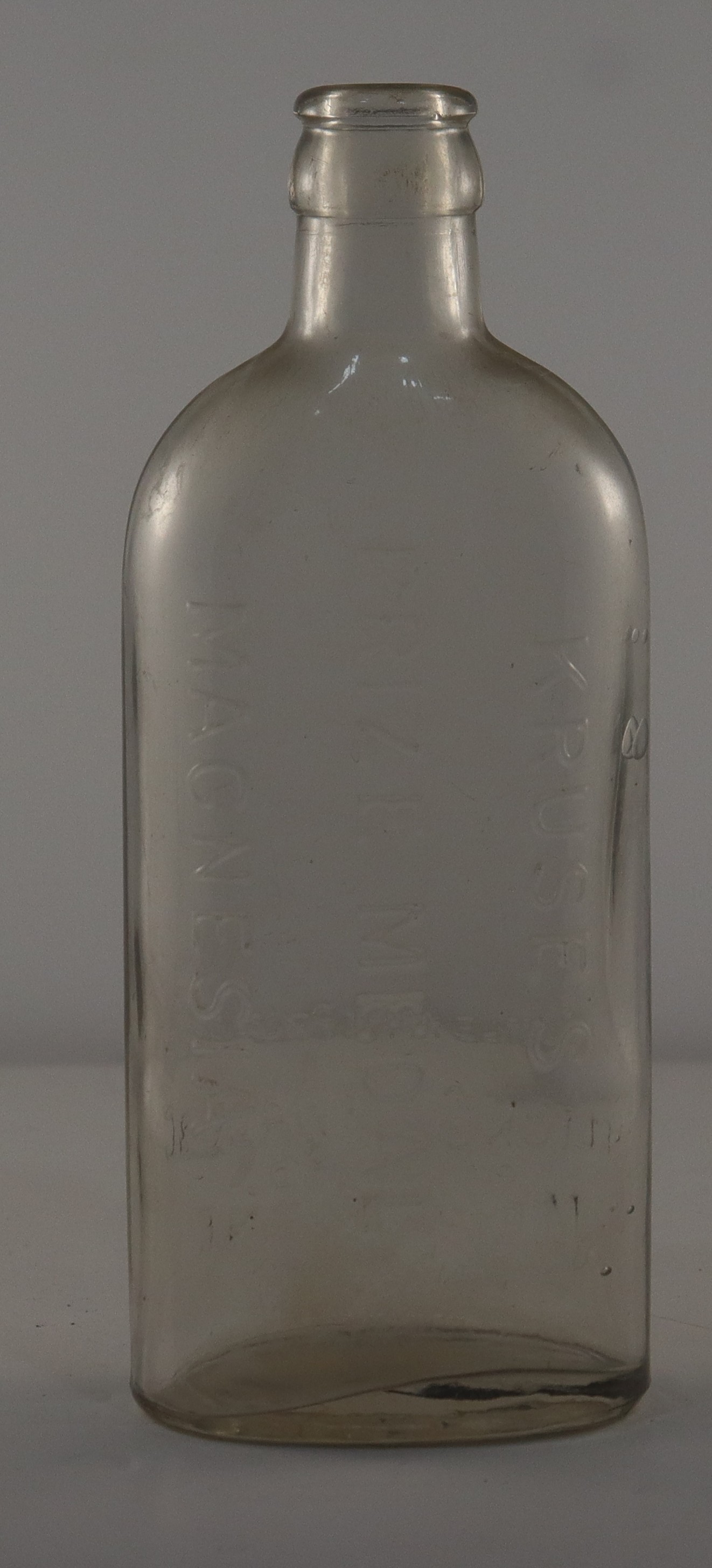 On the bottle in embossed lettering is "KRUSE S PRIZE MEDAL MAGNESIA". On the other side at the heel of the bottle is embossed "This bottle is The Property of Felton Grimwade&Co. Pty Ltd. Melbourne"