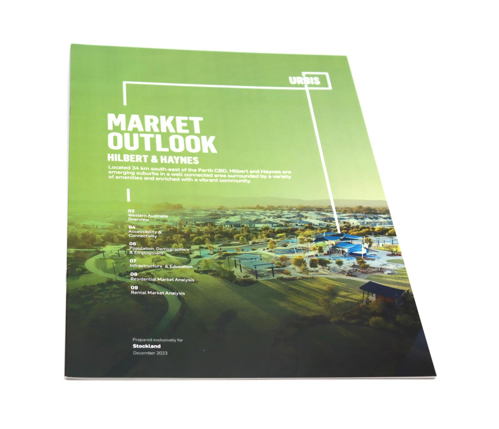 2023 - 2024Card covered booklet. The main colour for the front cover is green and the back covers is black with white printing. On the front cover is a photograph of the Shipwreck Park playground in Hilbert, with suburban housing in the area beyond the playground. Printed at the top of the front cover in white is [URBIS]. Below this is printed [MARKET / OUTLOOK / HILBERT & HAYNES], with more details of the area and an index to pages printed in white on the lower front cover.