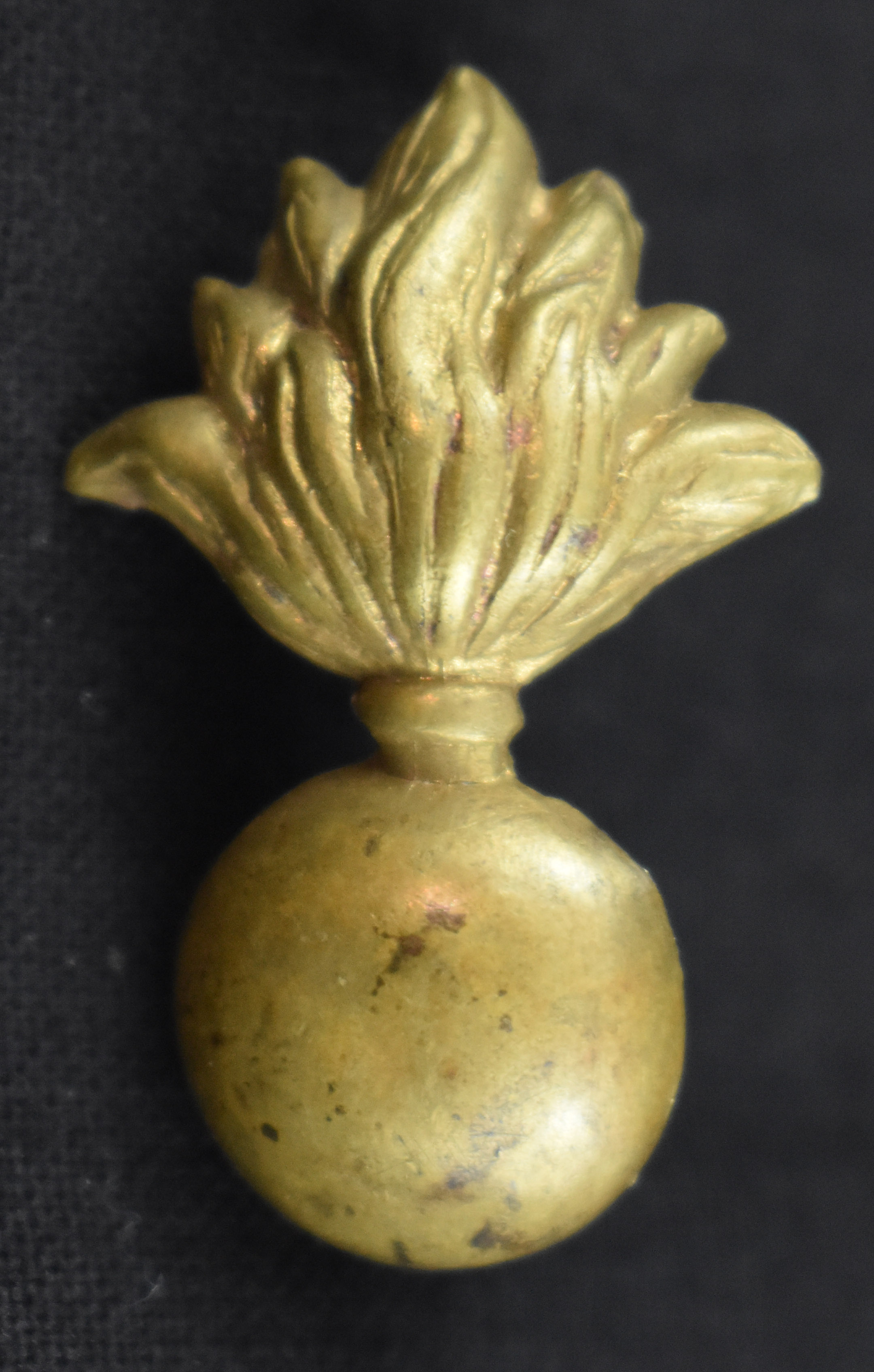 c. 1900Small ‘Flaming Grenade’ shaped brass relief badge with two (2) lugs on back.