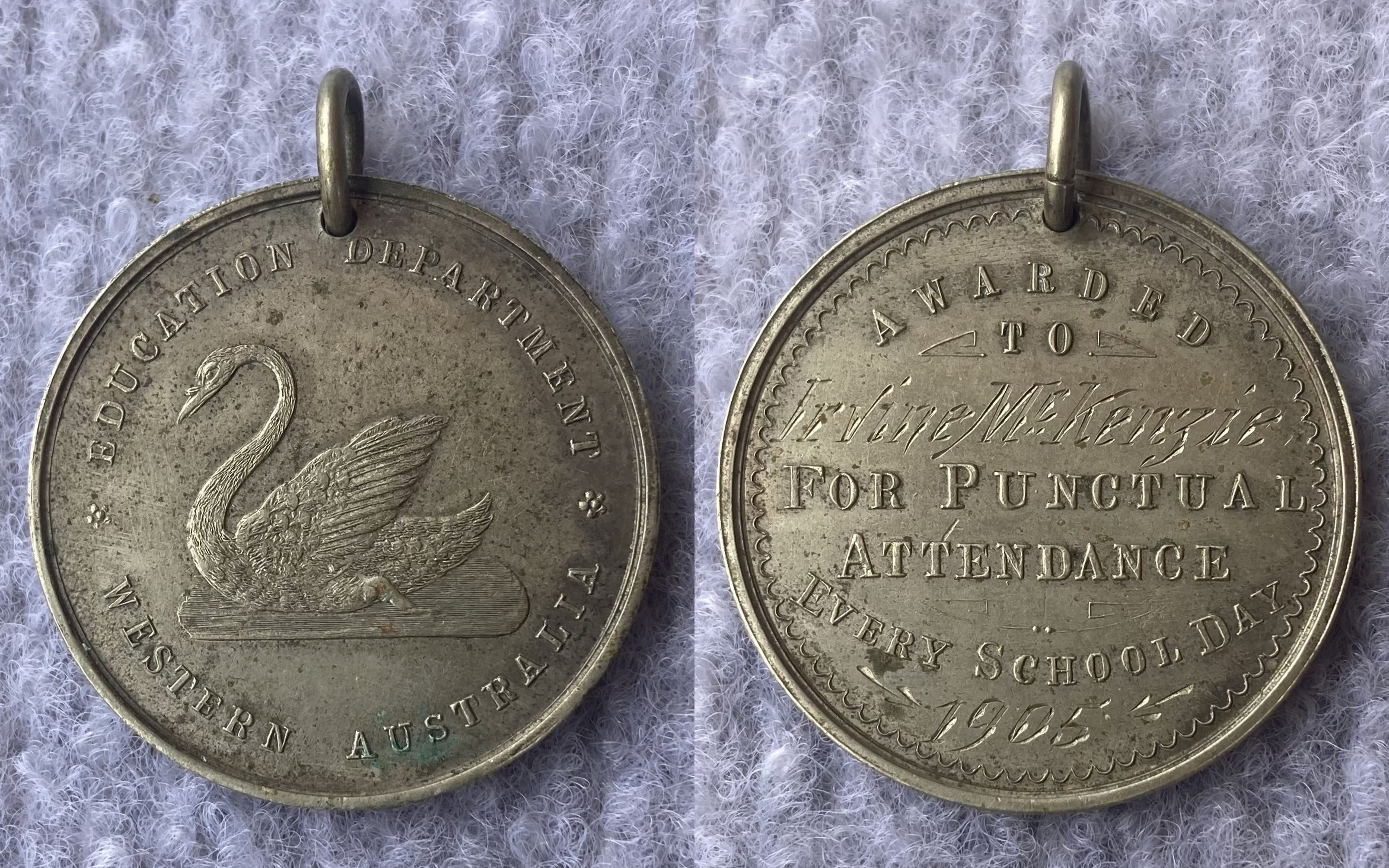 Education Department of WA medallion awarded to Irvine McKenzie, Albany 1905