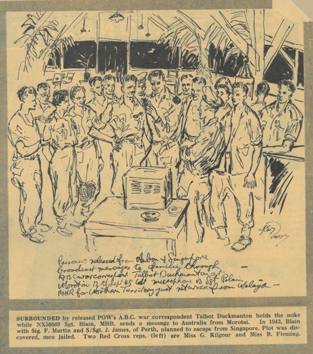 Newspaper copy of pencil sketch by war artist Tony Rafty of released prisoners on Morotai sending messages to Australia. One identified is NX56669 Adair Macalister Blain, MHR. Blain was educated at Perth Modern School and as 2126 served in 51 Battalion and 31 Battalion during WW1. As an Independent representing the Northern Territory he was the only Federal Member of Parliament to be held as a prisoner of war during World War 2.