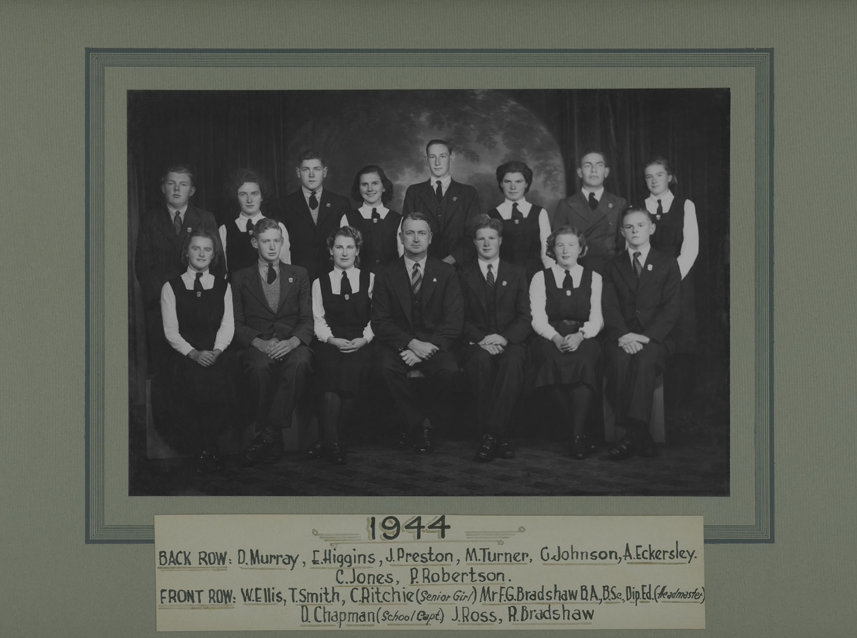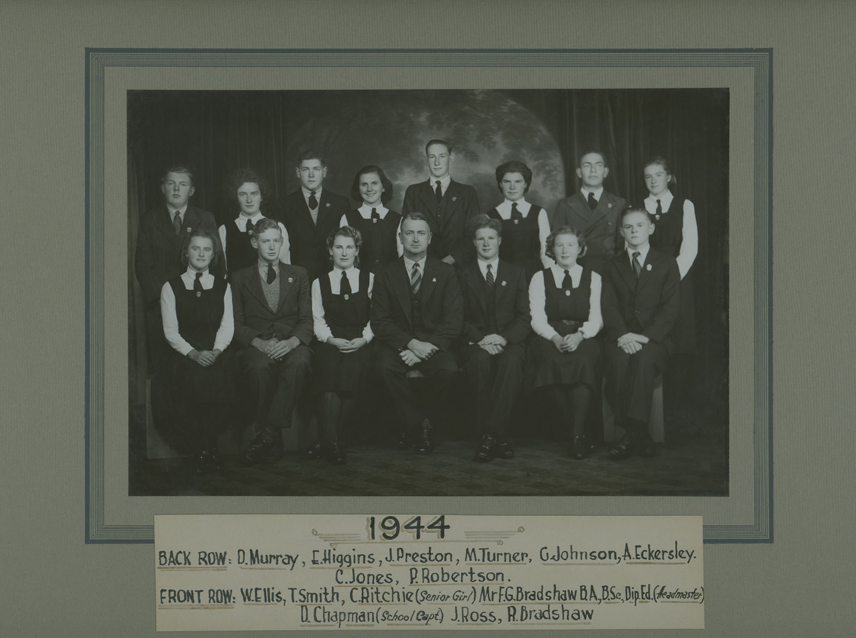 Front: Winifred Ellis, Toll Smith, Carole Ritchie (Senior Girl), Frank Bradshaw (Headmaster), Don Chapman (School Captain), Joan Ross, Reg Bradshaw