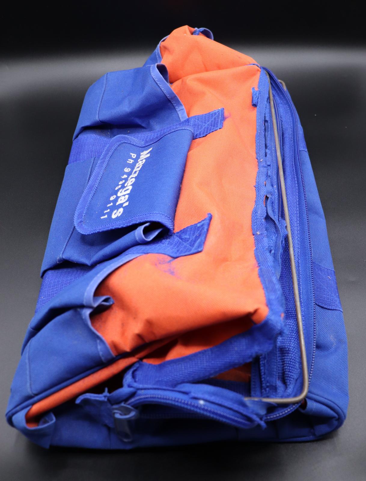 Medium sized tool bag with orange top and blue pockets down the side of the bag. medium sized velcro close pocked on side of the bag has white stitching with the words:
