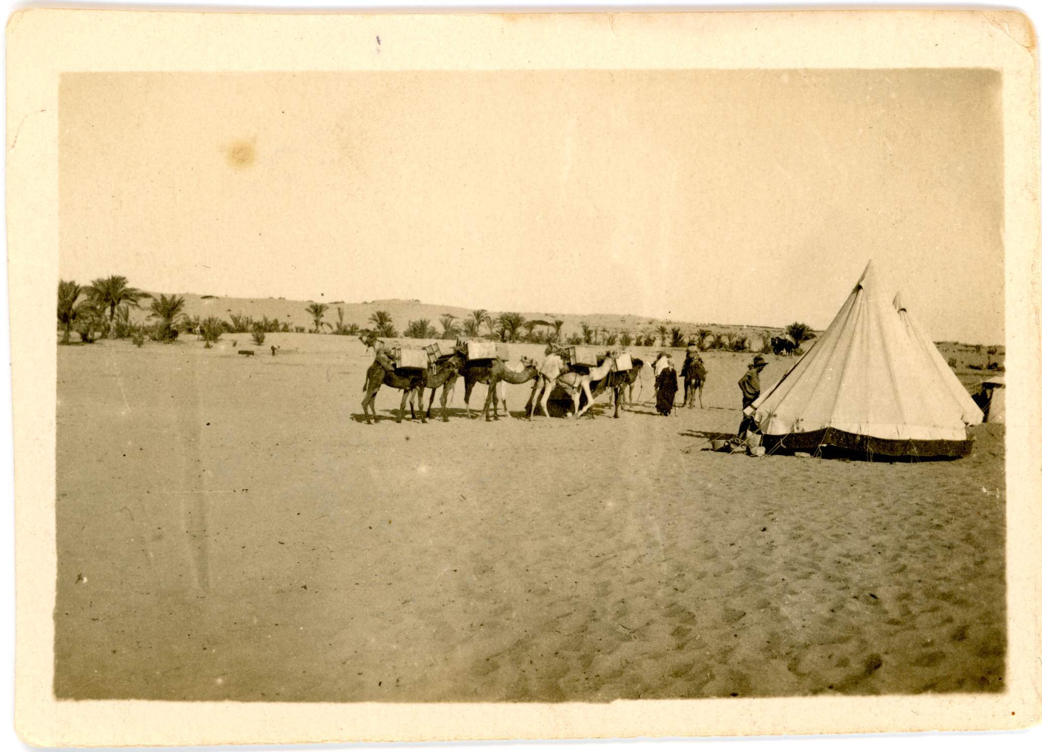 1916 - 1918A small black and white photograph showing two bell tents with a soldier standing outside of one. To the left of the soldier is a line of at least seven well laden camels and their cameleer. In the distance another camel is being ridden, and a further man is working. There are numerous palm trees in the background. The image has a small border and the photograph is in good condition. There are 2 small pencil marks on the reverse but no staining front or back.