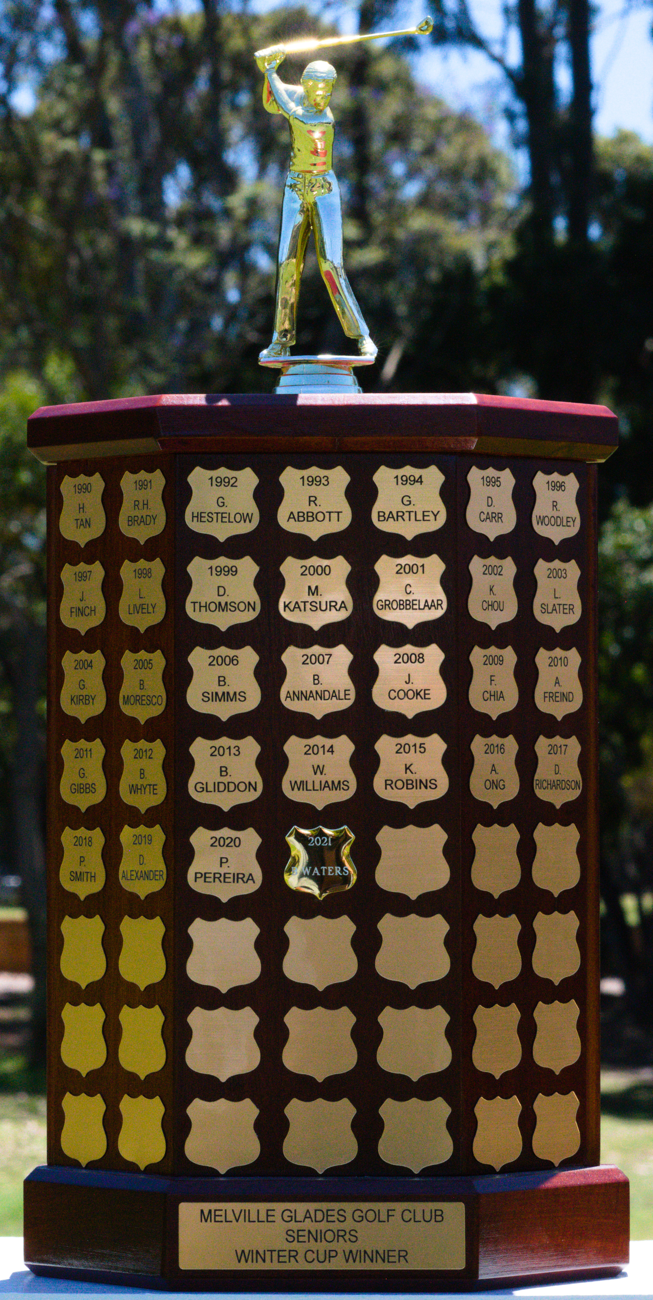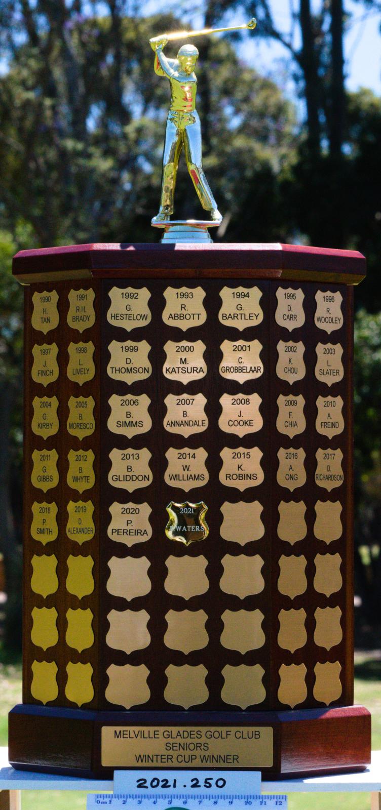 This perpetual trophy recognises the winners of the Seniors' Winter Cup. Winners' names appear on gold crests attached to the main stem of the trophy.