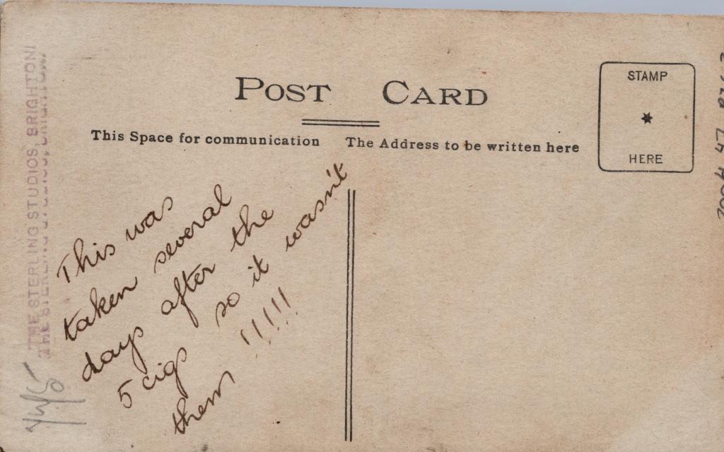 Reverse: Written in black pen 'This was taken several days aster the 5 cigs so it wasn't them!!!!!'