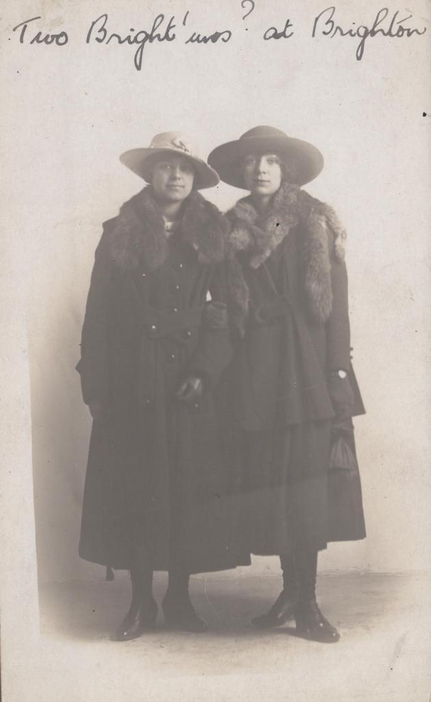c. 1913Postcard showing two unknown women. The text 'Two Bright' wos? At Brighton' is seen.