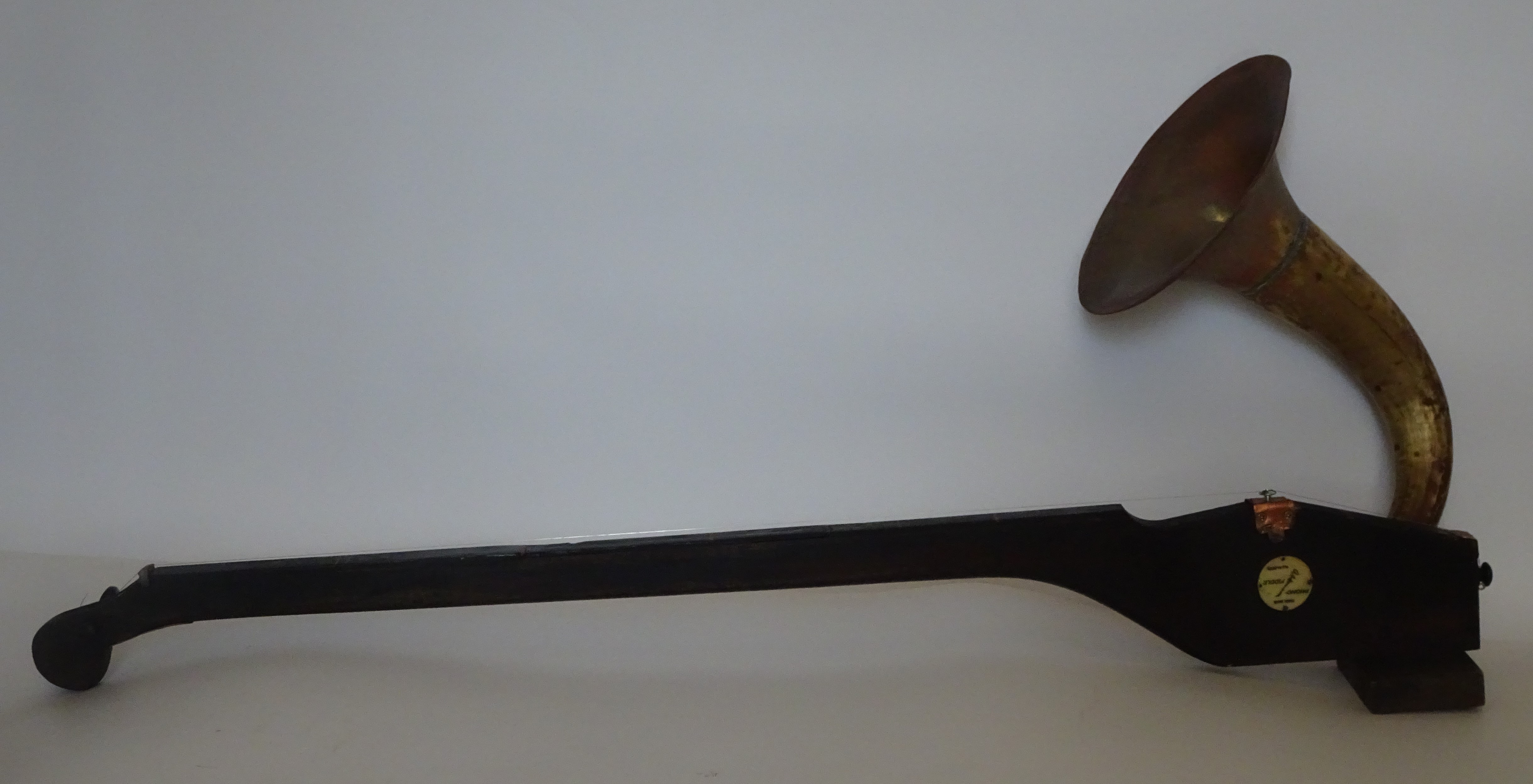 A phono-fiddle is a one stringed instrument with a brass trumpet attached. The end away from the trumpet is damaged making it impossible to string the instrument. Long wooden section has frets cut into the side. The instrument was repaired in April 2022 by Ivan Halbert.