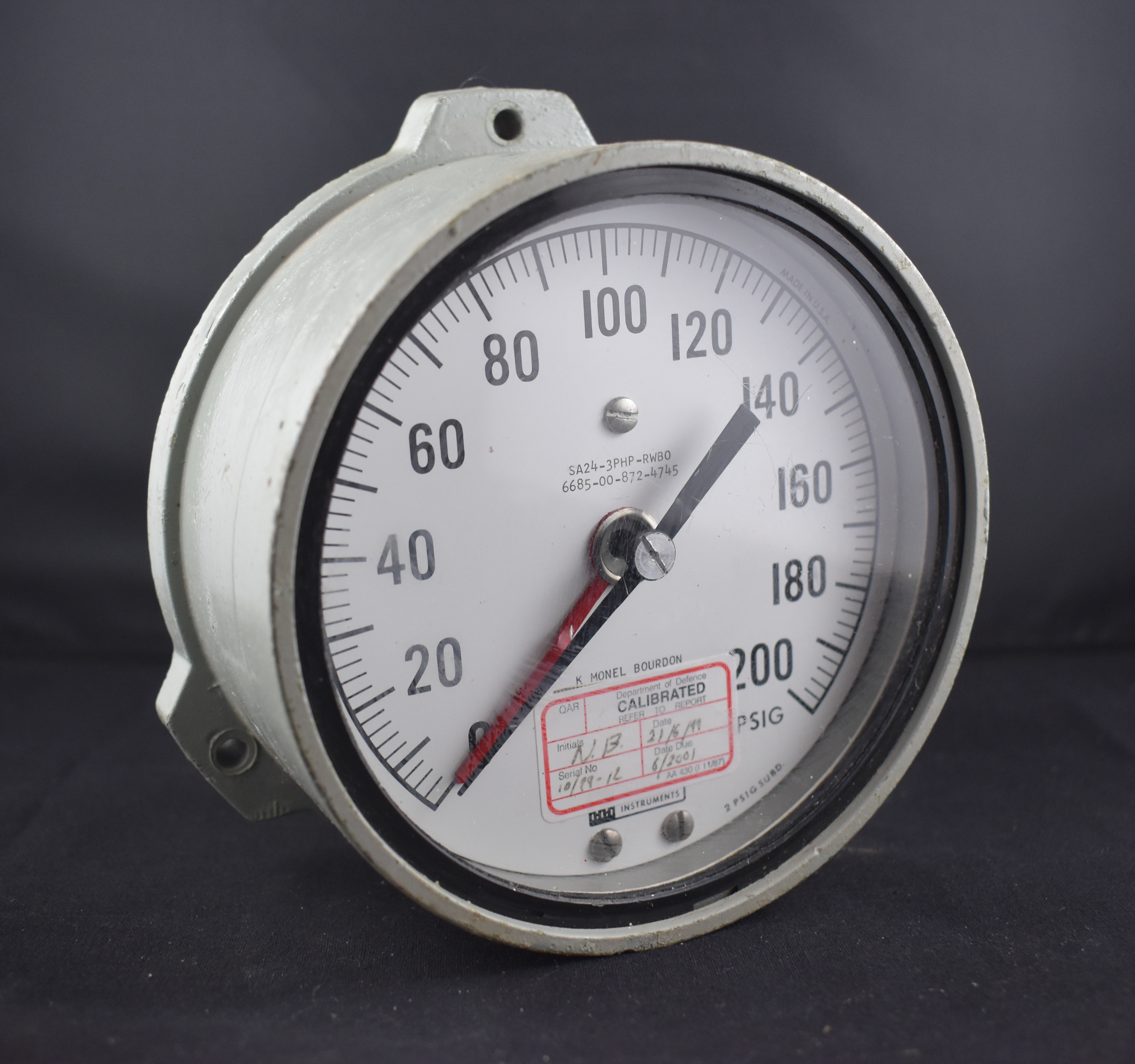 On front "QAR / Department of Defence / CALIBRATED / REFER TO REPORT / Initials N.B. / Date 21/6/99 / Serial No 10/99-16 / Due Date 6/2001 / AA 430 (I 11/87)" on adhesive label."PERTH / FWD DIESEL / F/MAIN (5) / COOLING / 0-200" written in black marker on back.