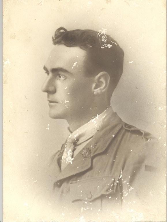 Print of sepia head and shoulders studio portrait of Reg Cargeeg. His curly hair is short and he is facing left showing a strong, handsome profile. He is wearing army tunic, shirt and tie, and has a rising sun badge on his left lapel.