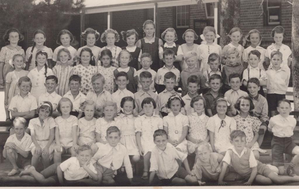 Black and white landscape photograph of a primary school class ('probably Rosalie PS, Subiaco' written on back). There are fives rows of young boys and girls on tiered benches outside of the school building (perhaps a courtyard?), the front row contains five boys who are laying down. They are not wearing school unifrorms but all the boys are wearing collared shirts and the girls are in nice dresses. One girl in the middle of the back row is a head taller than the rest.