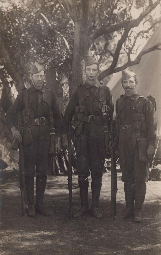 c. 1913Postcard showing three men in uniform. Trees are seen in the background.