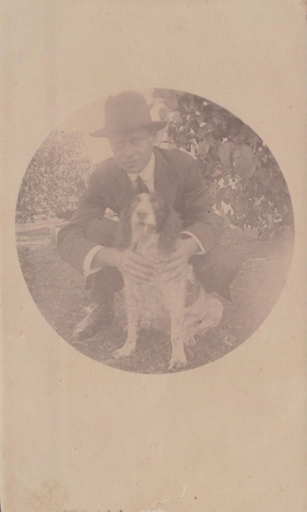 c. 1913Postcard showing an unknown man crouching with a dog.