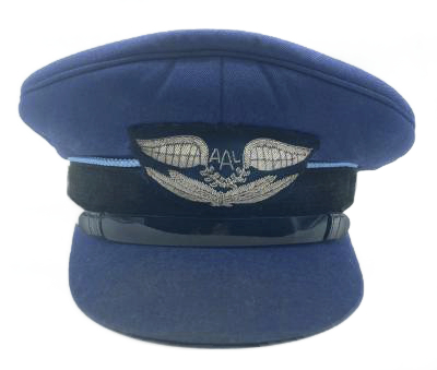 Blue peaked cap with raised padded top bearing the logo of the Australian Air League in silver bullion (wire thread) on the front. It has a black band with a black vinyl strap below and a contrasting light blue braid above. The central logo reads 'AAL' and has garlands of leaves below and outstretched wings either side.