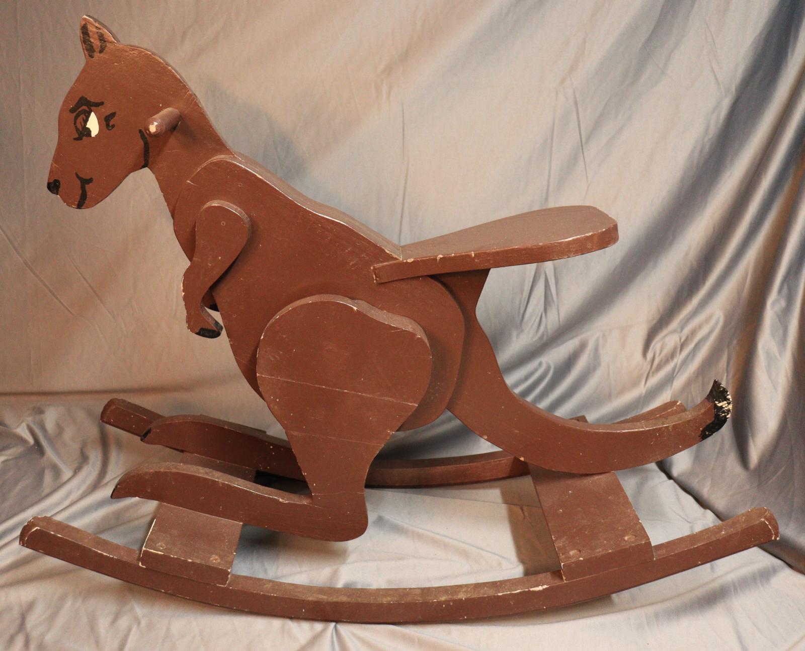 Rocking toy in the shape of a kangaroo. The toy is painted brown, with black painted markings on the tail and toes/fingers, as well as black painted facial features.