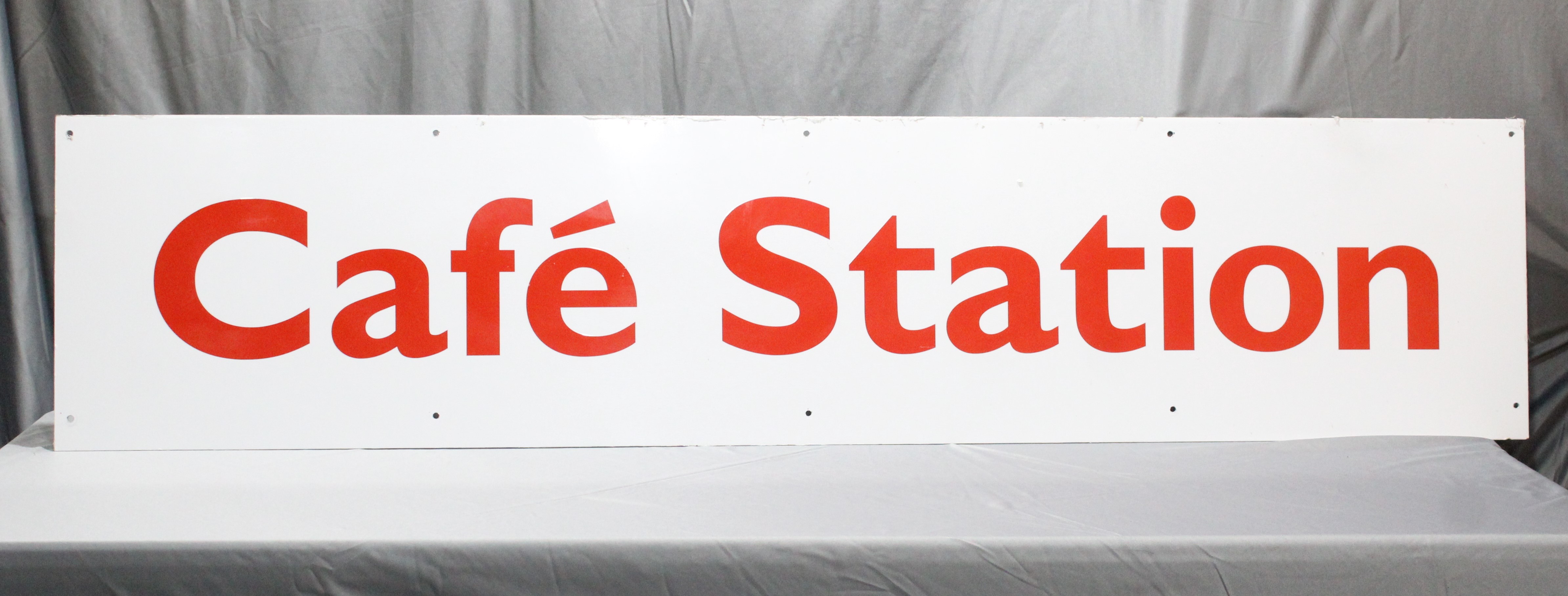Long, thin, metal, rectangle sign with a white front, with red letters "Caf? Station" across the length of the sign.