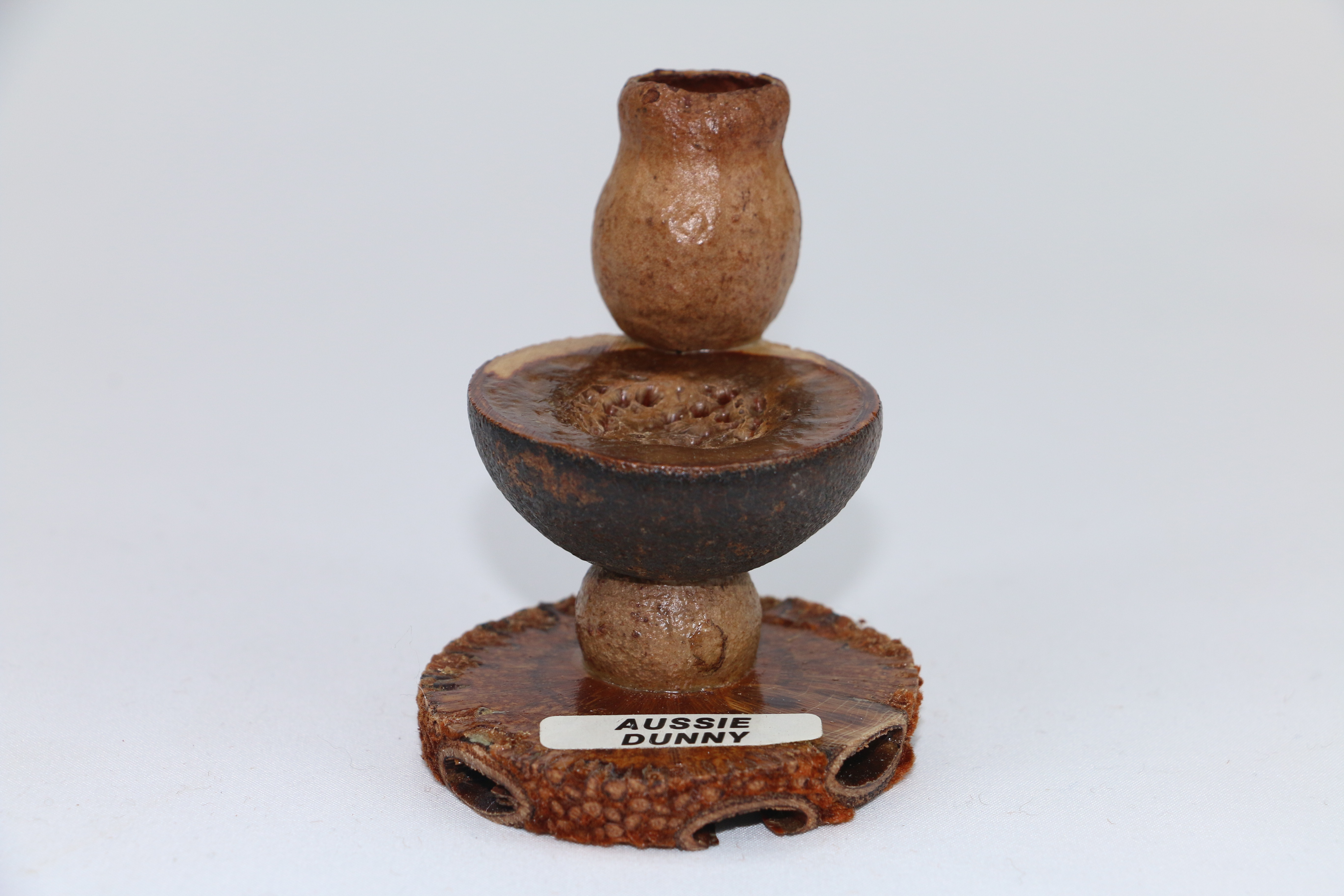 Toilet gumnut figurine made from cross-cut Banksia nut with glued nut supporting a mallee type nut with hollowed-out cross-section depicting toilet bowl with gum nut atop depicting cistern. A label with words 'AUSSIE/ DUNNY' is attached to the Banksia base. The figurine is varnished with clear lacquer.