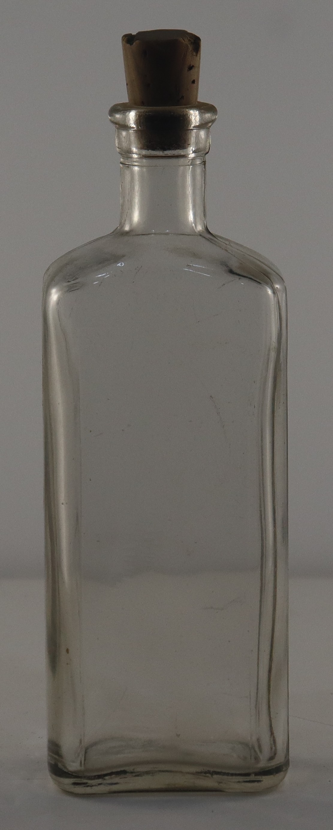 A clear bottle with a cork.