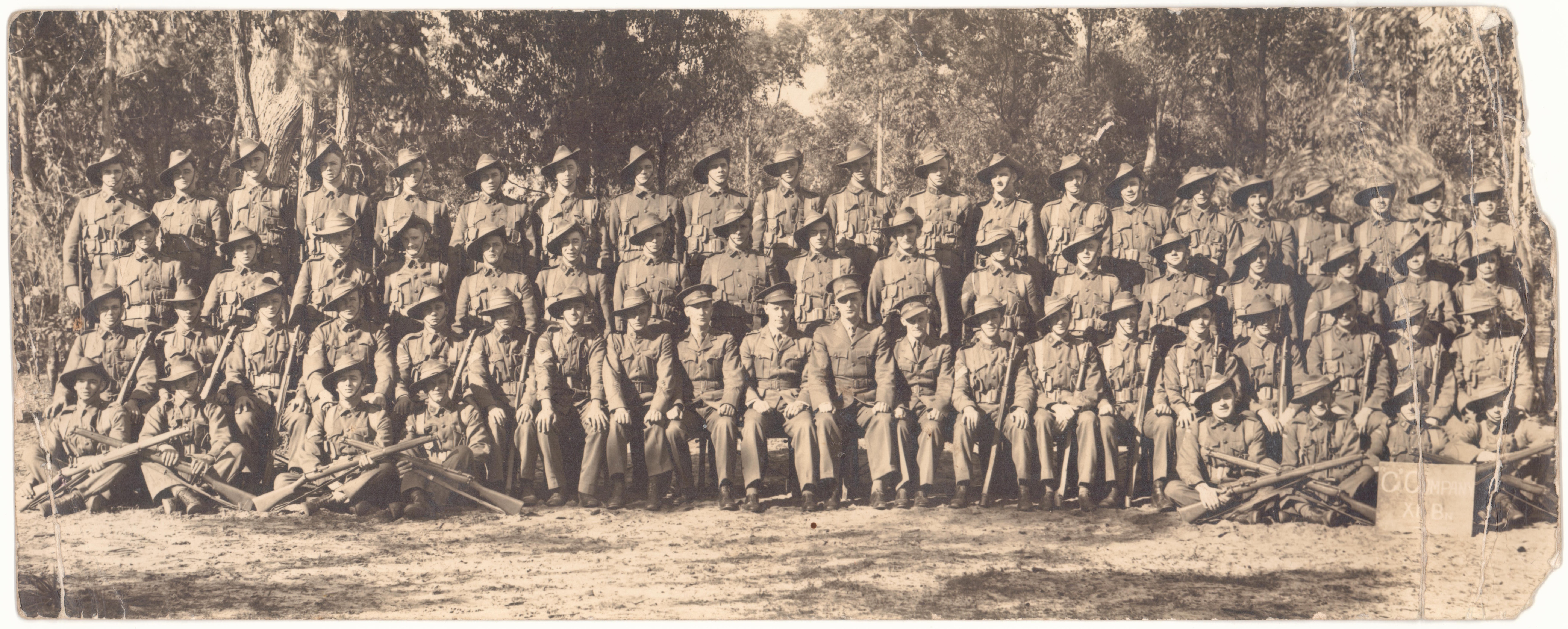 On the back of the photograph handwritten in pencil is "From Florrie Thompson" and on the right hand side handwritten in pencil is "11th Battalion C Company Militia approx 1939" and underneath is "Fred Cory Noel McDonald Lionel Thompson Colin Fraser".