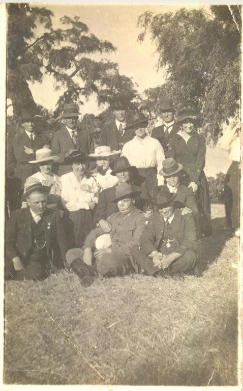 B/W Print. A group of eight men and five women, sitting kneeling and standing around William Bawden. The men are all in suits, shirts and ties and hats; the women are wearing long-sleeved summer outfits and large brimmed hats. The injured William Bawden is in army uniform with a patch over his right eye. The group is on rough grass under overhanging trees.