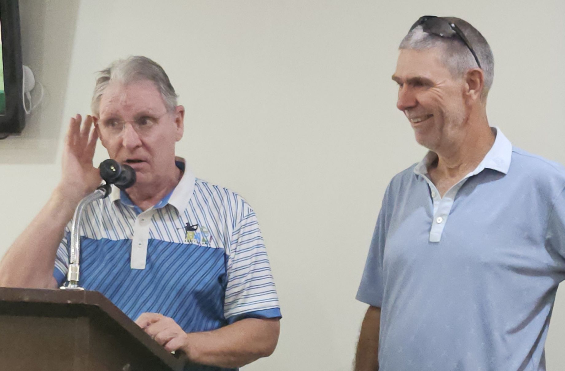 Ian is pictured (right) with Willie Henry during Willie's speech after they won the Men's Foursomes Nett Championship in 2025.
